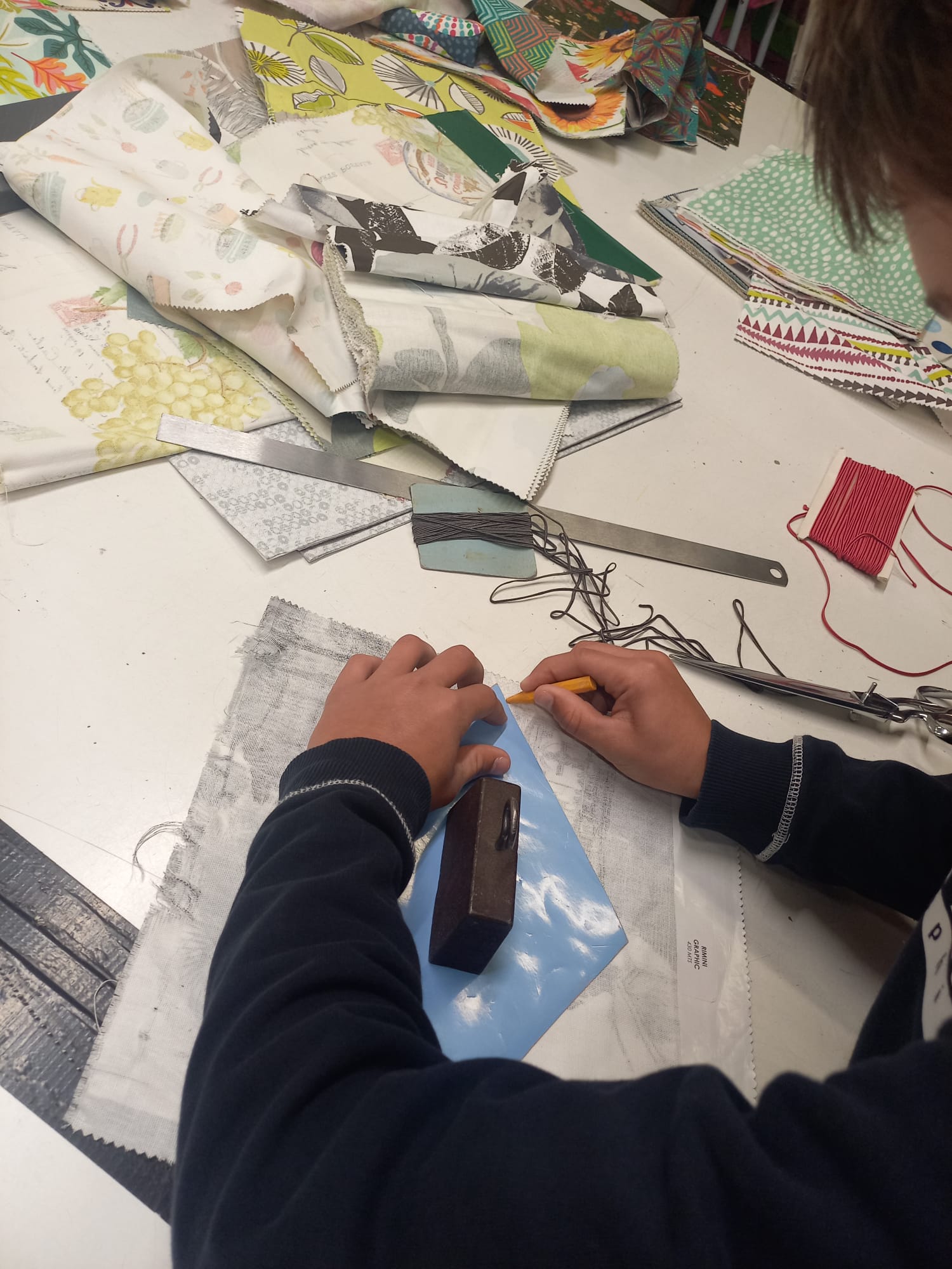 Atelier couture : création de fanions pour confectionner une guirlande décorative pour la classe.